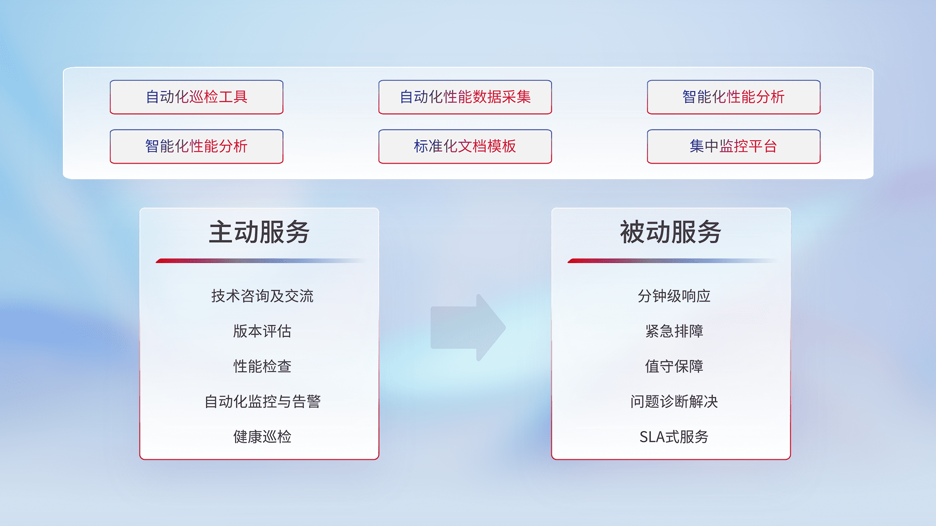 智能化工具和标准化文档,,,,保障服务质量,,,提供主动服务(包含技术咨询、、版本评估、、、性能检查、、、、自动化监控与告警、、、健康巡检)和被动服务包含(分钟级响应、、、紧急排障、、值守保障、、问题诊断解决、、、SLA服务)。。。。